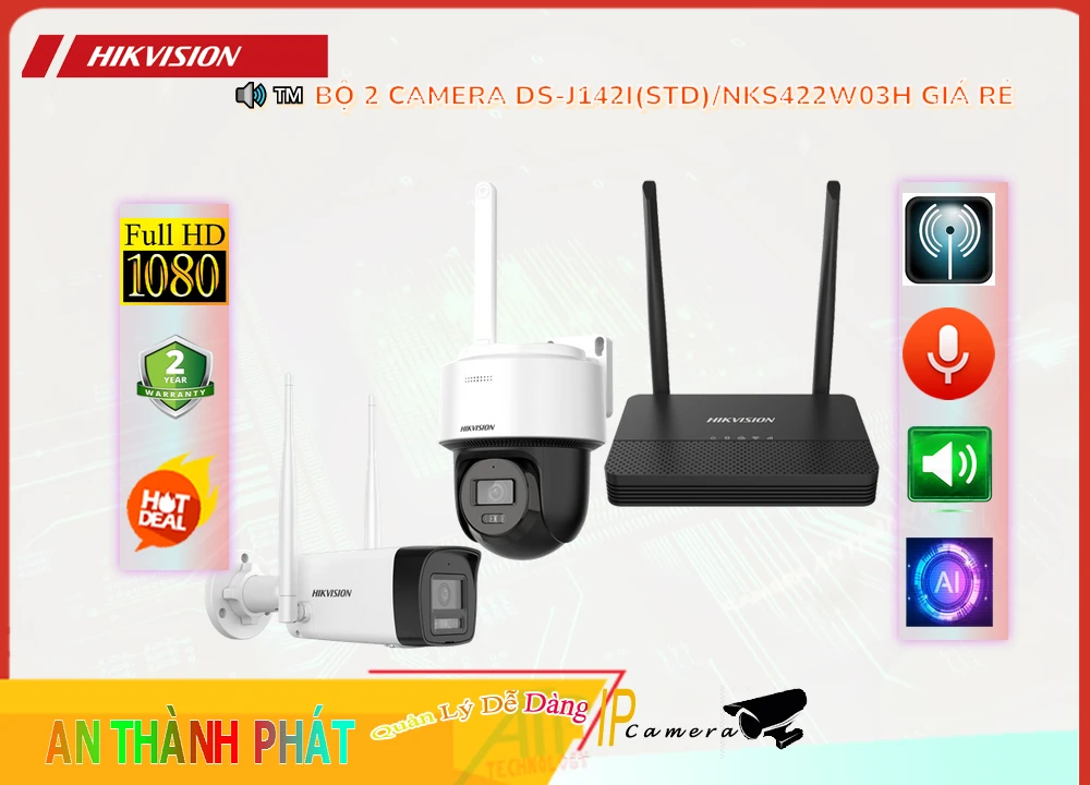 Bộ Camera IP WIFI DS-J142I(STD)/NKS422W03H là một giải pháp giám sát hiện đại và hiệu quả với những thông số vượt trội. Bộ kit bao gồm 2 camera 2MP, trong đó có Camera IP hình trụ DS-2CV1023G2-LIDWF và Camera IP quay quét DS-2DE2C200MWG/W, cả hai đều được tích hợp micro và tính năng đàm thoại hai chiều, mang lại khả năng giám sát âm thanh và hình ảnh rõ nét.